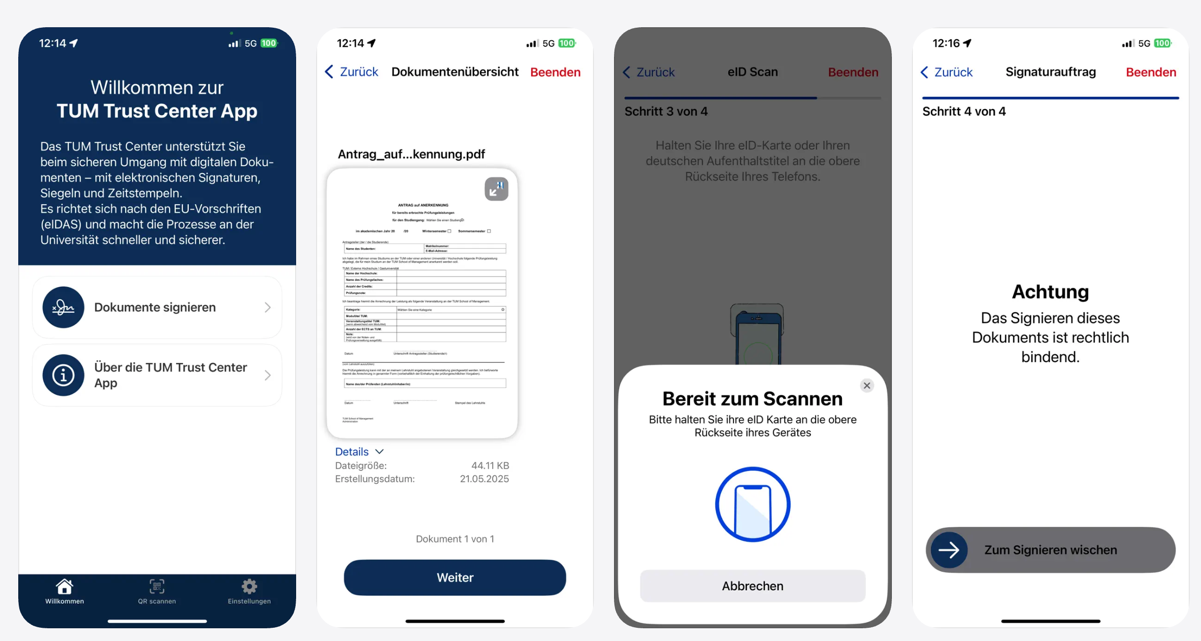 The app is designed to be as stateless as possible, relying on secure communication with the TUM Trust Center server for all operations. The app provides more convenient access to signature workflows, for example, through the eID, and enhances overall security by allowing certain verification challenges to be completed directly within the app, which the web application cannot do, thereby reducing the risk of comparison errors.